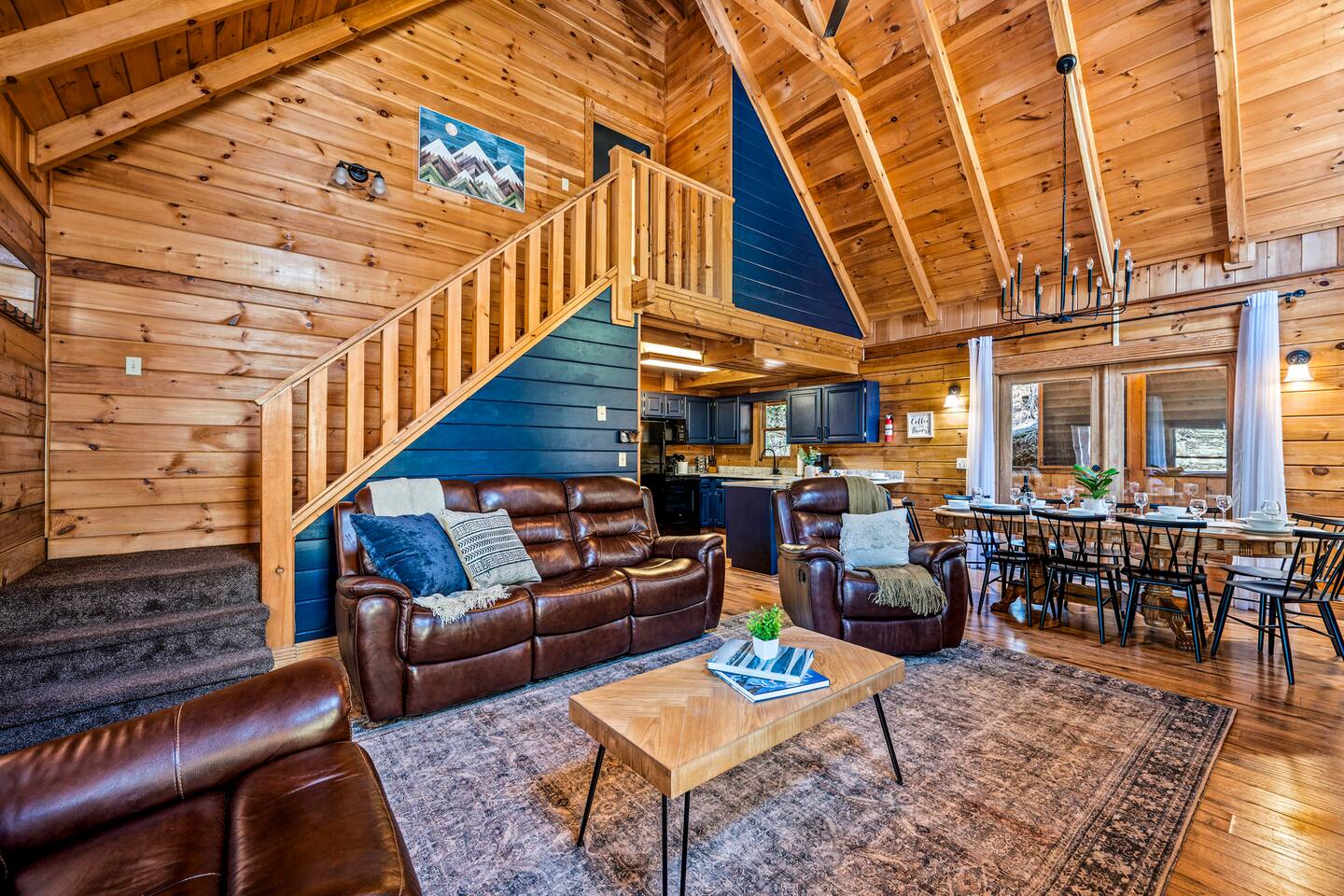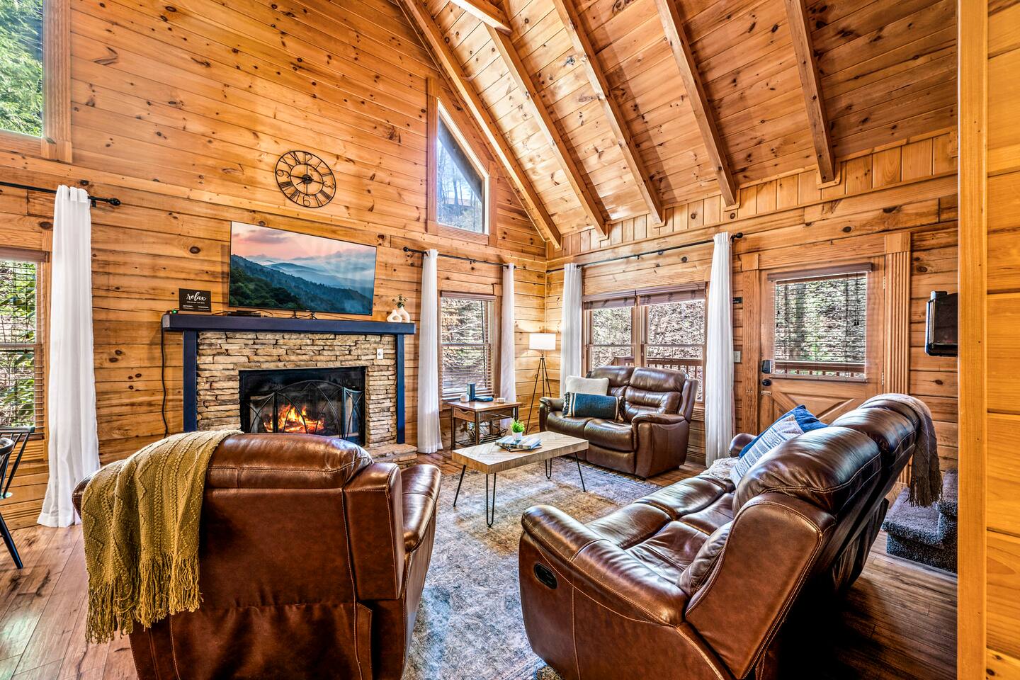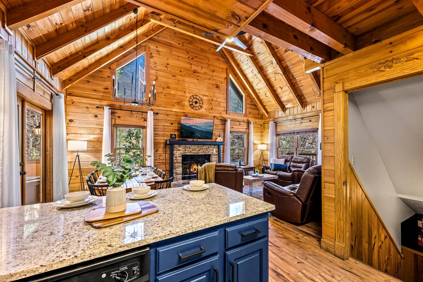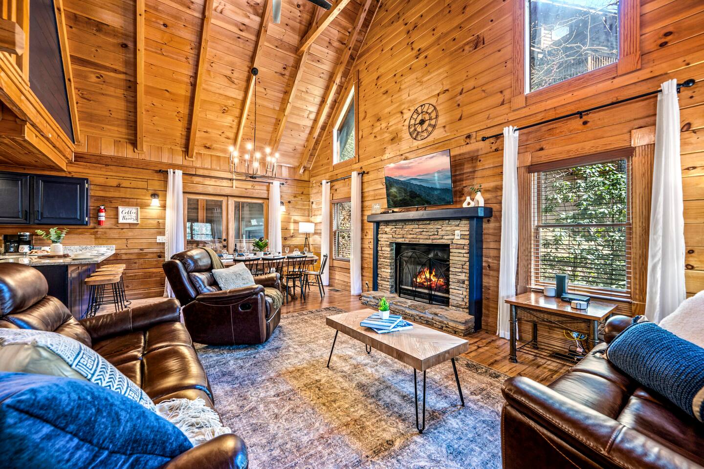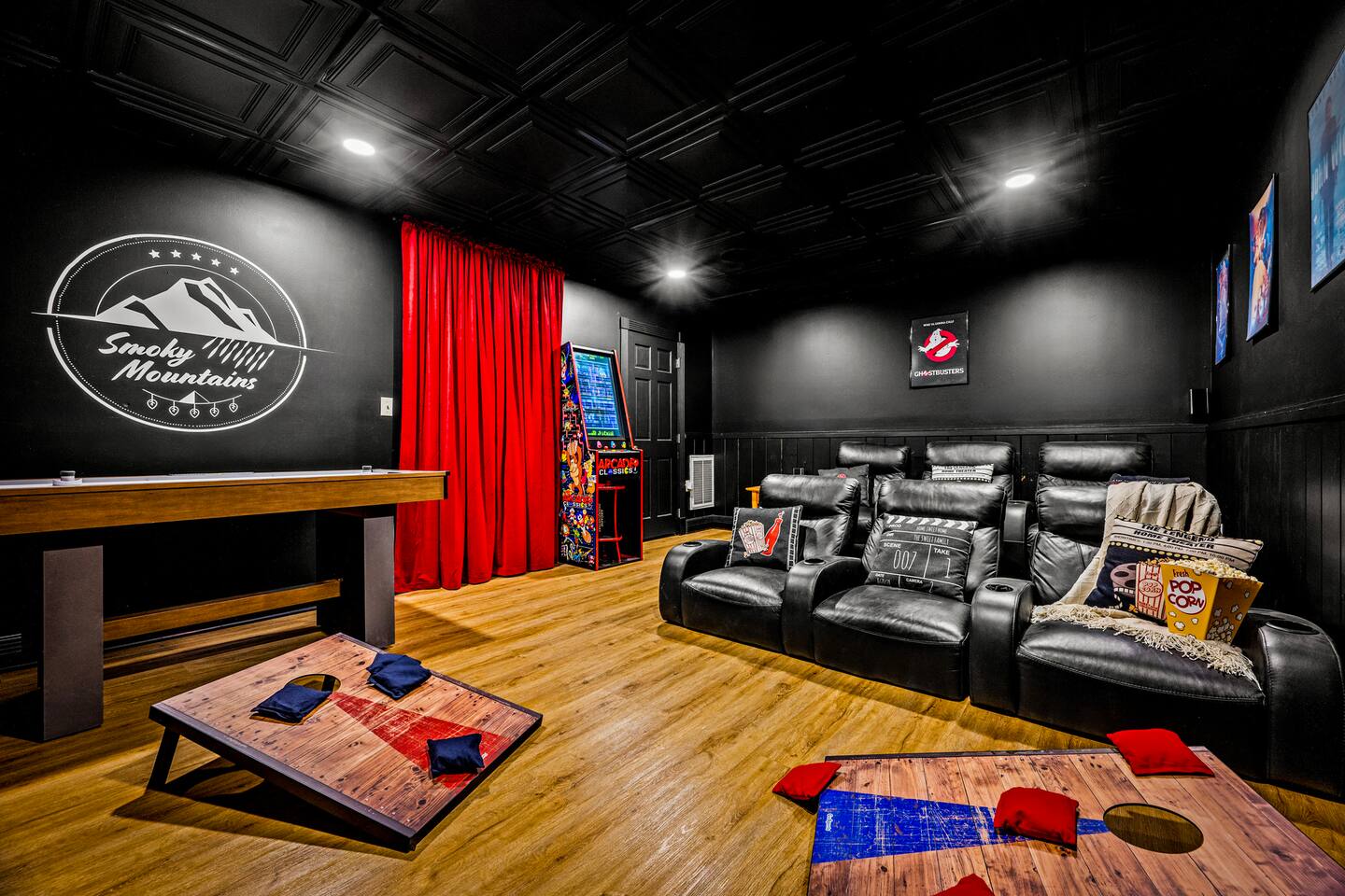 Good Vibes Cabin Pigeon Forge offers unbeatable location minutes to all attractions: ✓ The Island in Pigeon Forge (5 mins) ✓ LeConte Center (8 mins) ✓ Dollywood (13 mins) ✓ Pigeon Forge Snow (7 mins) ✓ Pigeon Forge Factory Outlet Mall (4 mins) ✓ Tanger Outlets Sevierville (8 mins) ✓ The Old Mill Restaurant (6 mins) ✓ Titanic Museum (6 mins) ✓ Smoky Mountain Alpine Coaster (7 mins) ✓ Dolly Parton's Stampede (7 mins) ✓ Wonderworks (8 mins) ✓ Anakeesta (16 mins) ✓ Ober Gatlinburg (20 mins) ✓ Rocky Top Sports World (24 mins) ✓ Laurel Falls Trailhead (28 mins) ✓ Great Smoky Mountains National Park (23 mins) * Note: Travel times may vary based on season and area occupancy. * As soon as you enter the majestic three-floor cabin, you're welcomed by a grand yet highly comfortable open-concept living area. Its unique setting and outstanding facilities will offer the levels of relaxation and convenience you are looking for in a vacation home. The fully equipped kitchen and inviting dining area open onto the pleasant living room with the intimate fireplace, setting the stage for many memorable evenings. Sun shines through large windows throughout the day, making the entire space bright and warm, enhancing the soothing ambiance under the majestic cathedral ceilings. Once you are ready to rest and relax, retreat to five cozy bedrooms where you can recharge after an exciting day of adventuring The Great Smoky Mountains. But wait! The best is yet to come – step out on the two covered porches to catch a breath of fresh mountain air and marvel at serene forest settings. The screened-in porch allows you to gaze at the surroundings from the luxurious hot tub while the designated BBQ master works their magic on the grill. When you’ve had enough of the great outdoors, you’ll be able to retreat to the basement theater room and have a fun movie night with your loved ones. There are endless options, and we can’t wait for you to experience them all! ★ THEATER/GAME ROOM ★ Come to the entertaining basement level to discover the private theater/game room. Let the posters on the wall inspire the movie choice that you‘ll get to watch in the great company of your family and friends. Be careful, though. You‘ll quickly lose track of time in this fun space! ✓ 86" Smart TV with Netflix ✓ Two-Row Theater Leather Seating ✓ Arcade Machine ✓ Coinless Candy Machine ✓ Air Hockey ✓ Cornhole ✓ Board Games ✓ Custom “Smoky Mountains” Mural ★ LIVING ROOM ★ It immediately feels like home! Cuddle up by the intimate fireplace, grab your favorite snacks and drinks, and spend precious moments with your friends in this contemporary open-concept space. ✓ Comfortable Leather Sofas ✓ Cathedral Ceilings ✓ Smart TV (Bring your own login) ✓ Indoor Fireplace (non-operational from April 1 - October 1) ✓ Coffee Table ✓ Stylish Reading Lamps ✓ Access to the Two Decks ★ KITCHEN & DINING ★ This kitchen is fully equipped with state-of-the-art cooking appliances that make it suitable for preparing any meal, whether a simple breakfast, quick snack, or a three-course gourmet dinner. Spacious granite countertops and the central kitchen island provide plenty of room to work your MasterChef magic. ✓ Microwave ✓ Stove ✓ Oven ✓ Toaster ✓ Blender ✓ Coffee Makers (Keurig, Drip Coffee Machine) ✓ Hot Water Kettle ✓ Refrigerator/Freezer ✓ Dishwasher ✓ Sink ✓ Glasses ✓ Silverware ✓ Pots & Pans The lovely dining area sits right next to the kitchen. Serve your delicious meals for the whole family at the dining table if you choose to stay in and enjoy a home-cooked meal. Tasty breakfasts, quick snacks, and smaller meals can be served directly on the kitchen bar. ✓ Dining Table with Seating for 10 ✓ Kitchen Counter with Seating for 4 ✓ Outdoor Dining with Seating for 4 ★ SLEEPING ARRANGEMENTS – 5 BEDROOMS ★ The charming cabin features five tastefully furnished bedrooms. All offer high levels of comfort and convenience through their layout and cozy beds. (No uncomfortable sofa beds here!) Pick your bedroom to relax and rest after a memorable day of adventuring throughout the rich natural settings of The Great Smoky Mountains. ♛ Master Bedroom (Top Floor): King-Size Bed + Twin Trundle, Ensuite Bathroom ♛ Bedroom 2 (Main Floor): Queen-Size Bed ♛ Bedroom 3 (Main Floor): Queen-Size Bed ♛ Bedroom 4 (Basement): King-Size Bed, Ensuite Bathroom ♛ Bedroom 5 (Basement): Bunk Bed (Twin over Full), Ensuite Bathroom All offer a similar set of amenities and furnishing: ✓ Pillows, Linens, and Sheets ✓ Smart TVs (Bring your own login) ✓ Dressers with Spacious Drawers ✓ Night Stands ★ 4 BATHROOMS ★ Three bedrooms offer private en-suite bathrooms, while the two main floor bedrooms share a bath. ✓ Bathtub / Shower Combo ✓ Walk-In Shower ✓ Vanity ✓ Mirror ✓ Toilet ✓ Towels ✓ Hair Dryer ★ OUTDOOR AREAS ★ A gorgeous cabin like this would not shine in its best light if it did not have private outdoor spaces where you can relax, enjoy the serenity of the scenic natural ambiance, and marvel at the forest views. Choose from two charming porches featuring comfy seating areas and a luxurious hot tub. ✓ Screened-In Porch (Luxury Hot Tub, BBQ Grill, Dining Table with Seating for 4, String Lights) ✓ Front Porch (Romantic Swing Bench and Rocking Chairs) We're excited for you to find your happy place in "Good Vibes Cabin Pigeon Forge". You might want to switch off for a bit, catch a movie, or just cuddle up on the couch with a great book by the fireplace. Head outside to sip some coffee, or chill in the hot tub and soak up the peaceful vibes. Let us know if you have any questions; we have the answers. Happy Travels!