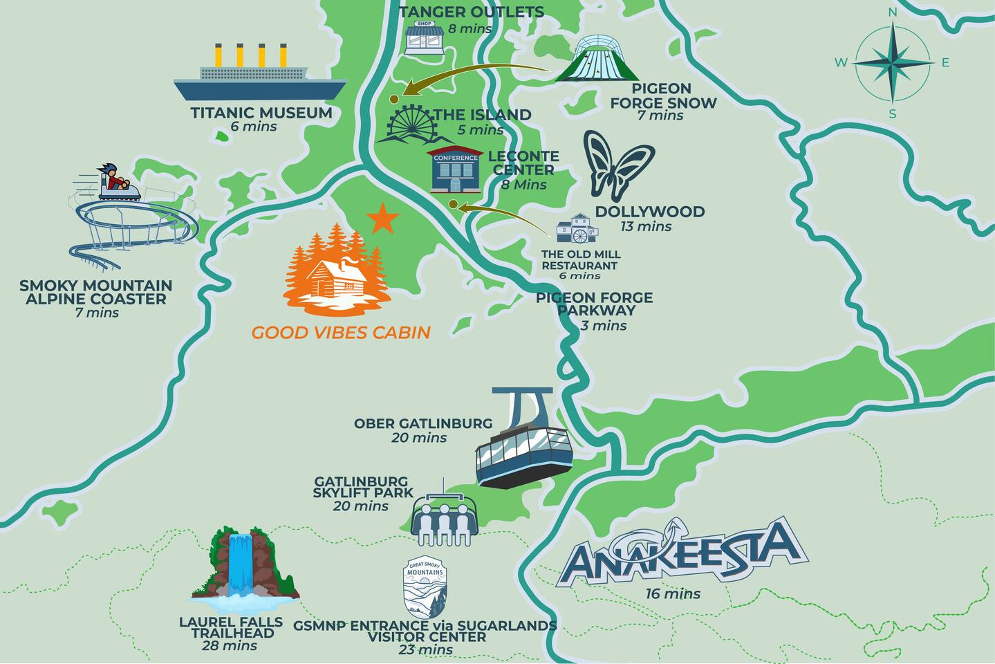 The cabin is situated right in the heart of Pigeon Forge, Tennessee. Its location and small-town charm offer a wonderful ambiance and a place to relax and refresh while being close to all the action. It provides a perfect escape from the everyday hustle and bustle of the big city crowds. Marvel at the gorgeous mountain settings while relaxing in the hot tub, or venture into Gatlinburg, Pigeon Forge, and Sevierville to discover many exciting attractions and landmarks. ★ FAMILY FUN ★ ✔ The Island in Pigeon Forge (1.3 miles) ✔ Pigeon Forge Snow (1.7 miles) ✔ Titanic Museum (2.7 miles) ✔ Smoky Mountain Alpine Coaster (2.8 miles) ✔ Wonderworks (3.0 miles) ✔ Dollywood (5.1 miles) ✔ Ripley's Believe It or Not! (9.4 miles) ★ SPORTS/EVENT CENTERS ★ ✔ Rocky Top Sports World (13.1 miles) ✔ LeConte Center (2.6 miles) ★ SHOPPING & DINING ★ ✔ Pigeon Forge Factory Outlet Mall (1.3 miles) ✔ Frizzle Chicken Farmhouse Cafe (1.4 miles) ✔ The Old Mill Restaurant (2.3 miles) ✔ Dolly Parton's Stampede (3.0 miles) ✔ Tanger Outlets Sevierville (3.6 miles) ★ OUTDOOR RECREATION ★ ✔ Anakeesta (9.0 miles) ✔ Ober Gatlinburg (12.1 miles) ✔ Roaring Fork Motor Nature Trail (12.3 miles) ✔ Bent Creek Golf Course (19.3 miles) ✔ Mt. Le Conte (19.8 miles) ✔ CLIMB Works Smoky Mountains - Zipline Tour (20.8 miles) ✔ Cades Cove (31.5 miles) ★ AIRPORTS ★ ✔ Gatlinburg Pigeon Forge Airport (8.1 miles) ✔ McGhee Tyson Airport (33.8 miles)